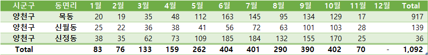 양천구 아파트 거래량 2019년 1월 ~ 2019 11월