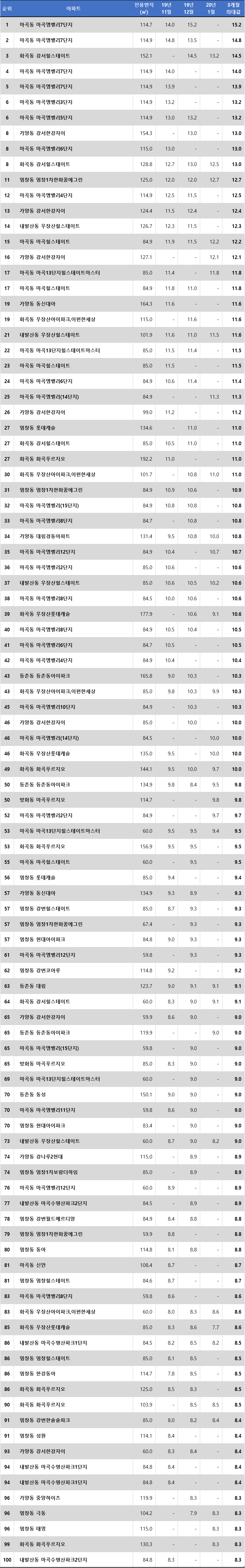 | 1 | 마곡동 마곡엠밸리7단지 | 114.7 | 14.0 | 15.2 | 15.2 | |