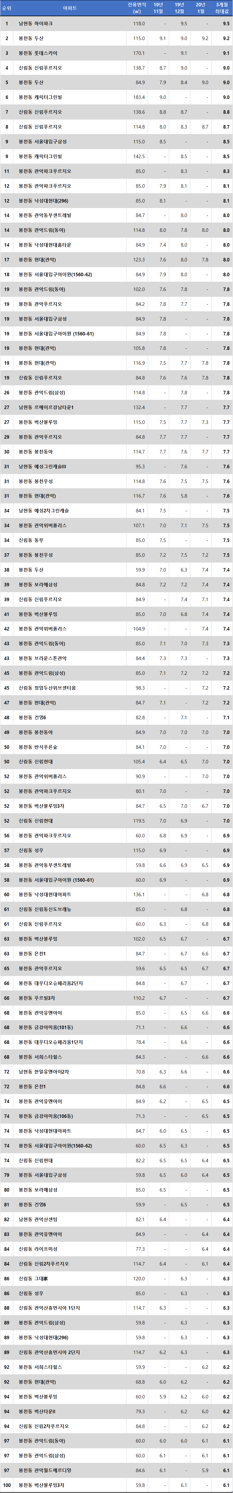 | 19 | 봉천동 관악드림(동아) | 102.0 | 7.6 | 7.8 | 7.8 | |