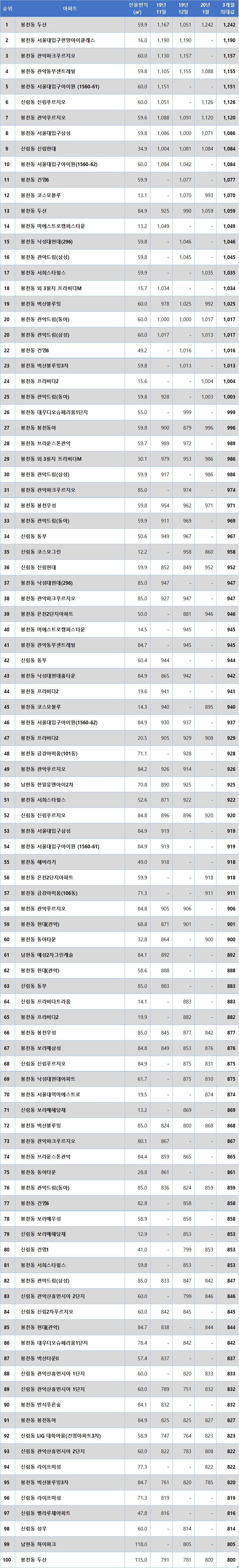 | 2 | 봉천동 두산 | 115.0 | 9.1 | 9.0 | 9.2 | 9.2 |