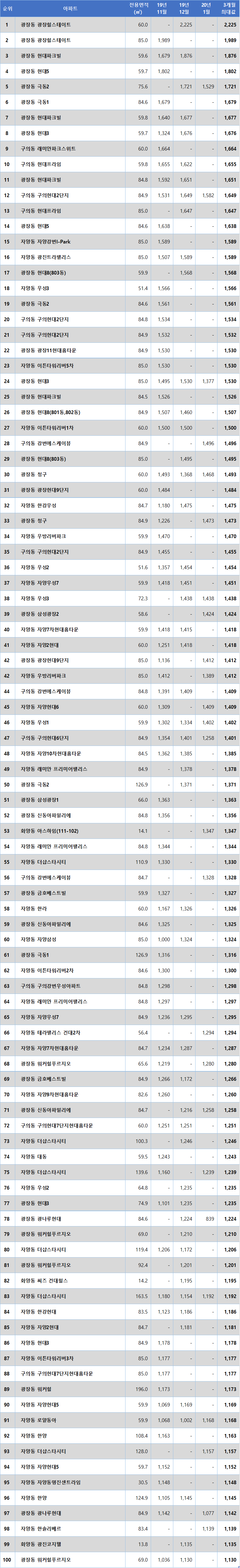| 순위 | 아파트 | 전용면적 (㎡) |