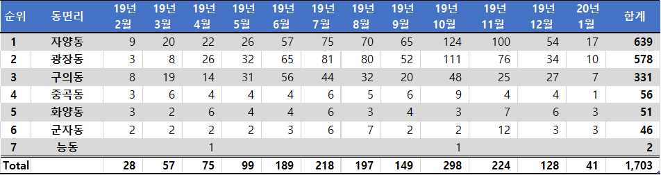 | 10 | 광장동 광나루현대 | 2 | 1 | 6 | 10 | 2 | 2 | 23 |