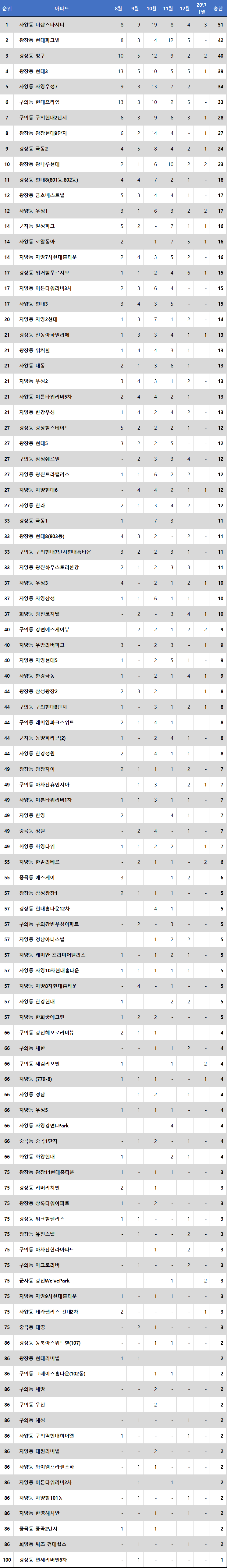 | 12 | 광장동 금호베스트빌 | 5 | 3 | 4 | 4 | 1 | 17 | |