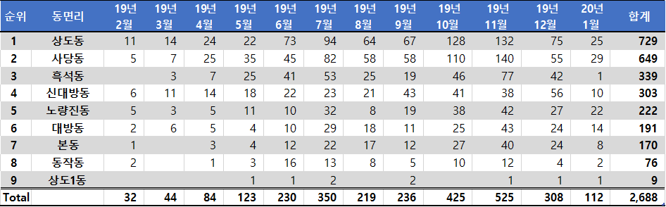 | 24 | 사당동 대림(169-8) | 2 | 9 | 5 | 2 | 3 | 3 | 24 |