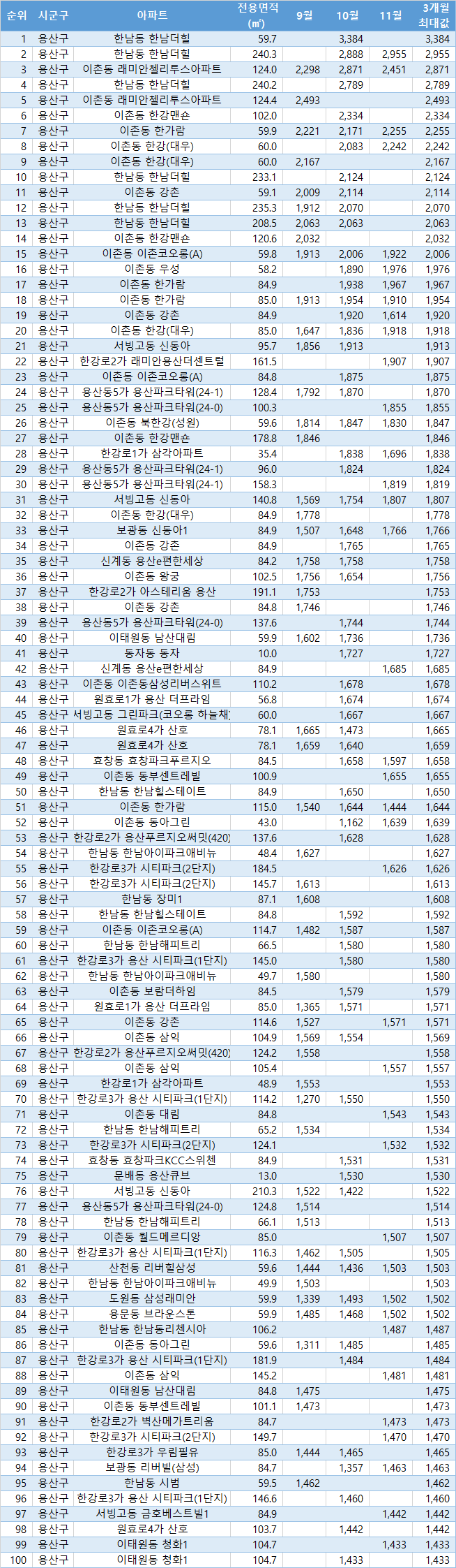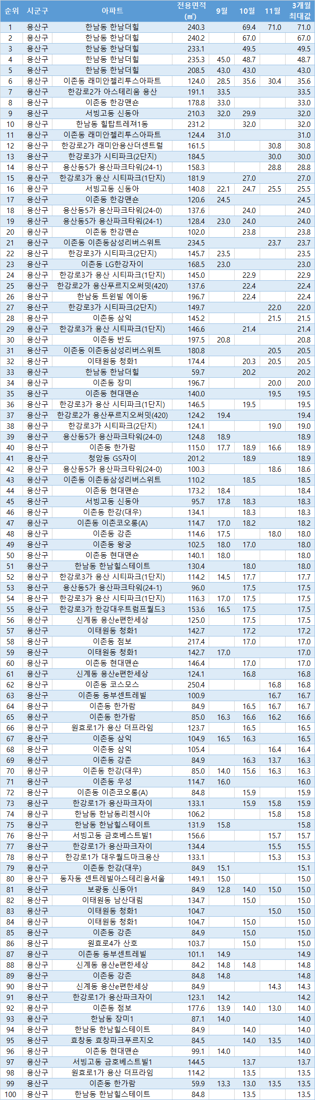 | 1 | 용산구 | 한남동 한남더힐 | 240.3 | 69.4 | 71.0 | 71.0 | |