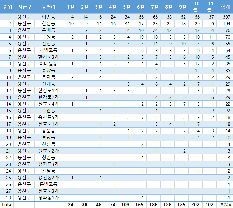 | 26 | 용산구 | 한강로1가 삼각아파트 | 2 | 1 | 2 | 1 | 3 | 1 | 1 | 11 |