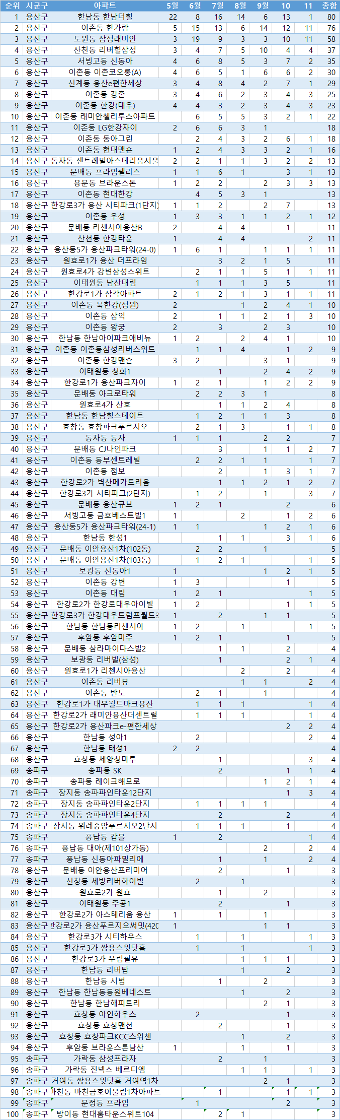 | 10 | 용산구 | 이촌동 래미안첼리투스아파트 | 6 | 5 | 5 | 3 | 2 | 1 | 22 | |