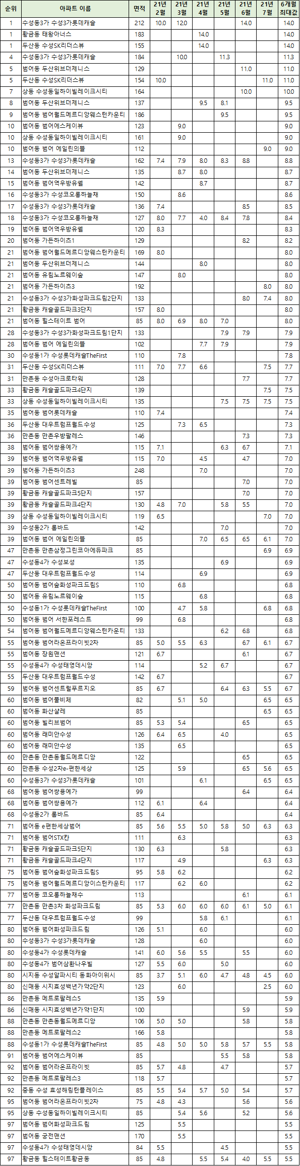 | 100 | 수성동4가 수성롯데캐슬 | 14.1 | 13.1 | 12.9 | 12.9 | 13.2 |