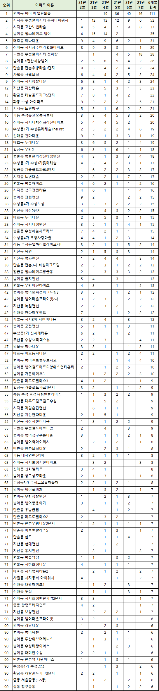 | 72 | 범어동 범어청구푸른마을 | 14.5 | 11.3 | 14.8 | 16.9 | 14.9 | 14.8 | |