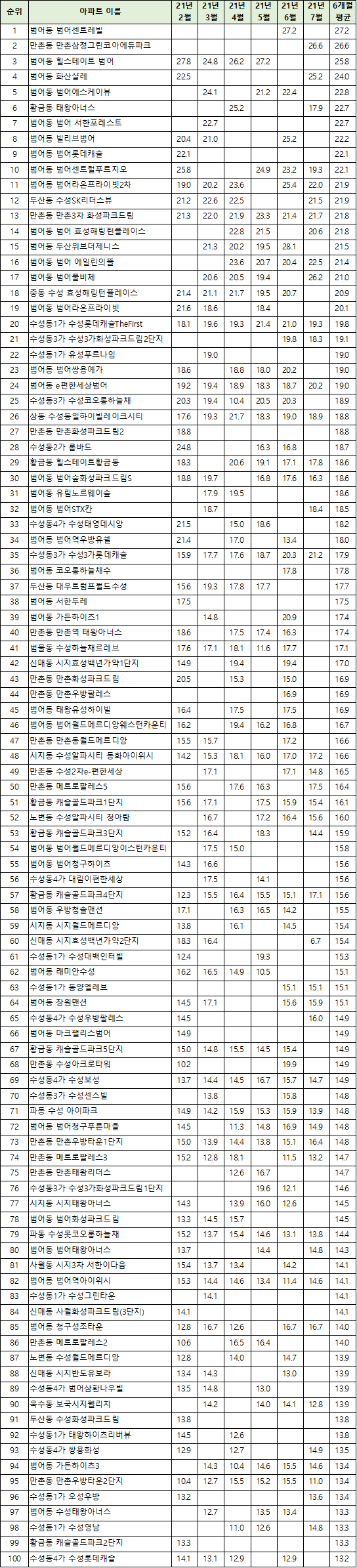 | 18 | 중동 수성 효성해링턴플레이스 | 21.4 | 21.1 | 21.7 | 19.5 | 20.7 | 20.9 | |