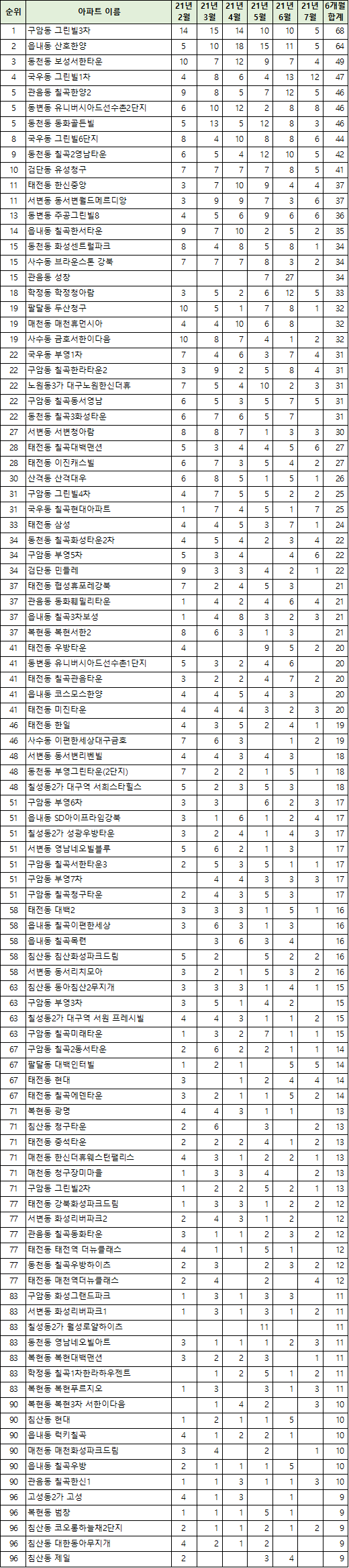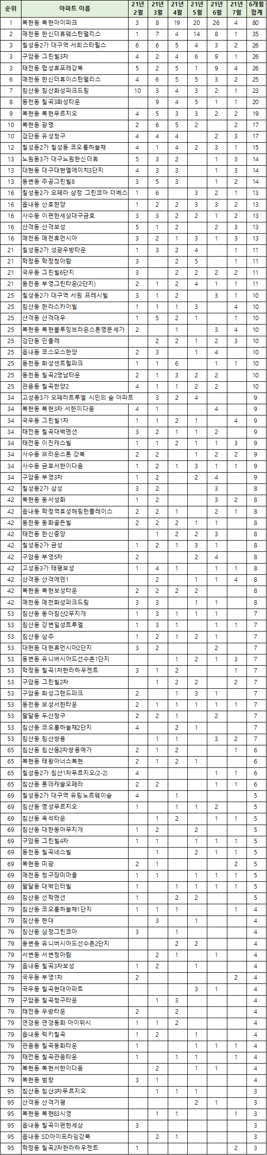| 대구광역시 수성구 부동산 아파트 매매 전세 가격 실거래가 거래량 집값 시세 동향 순위 21년 2월 - 21년 7월 기준 (0) | 2021.08.07 |