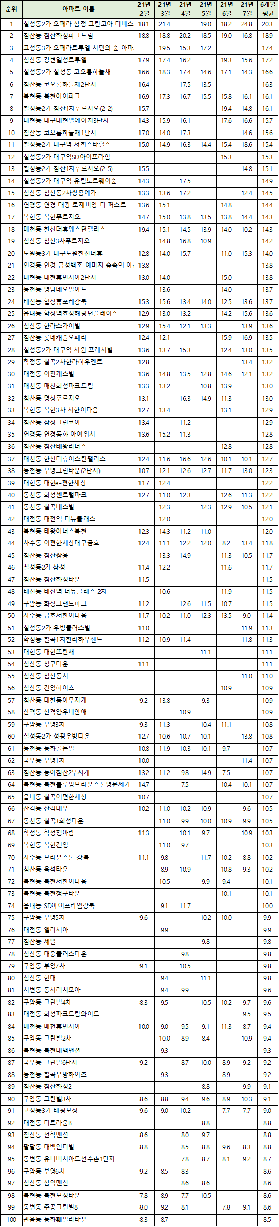 | 11 | 칠성동2가 대구역 서희스타힐스 | 15.0 | 14.9 | 16.3 | 14.4 | 15.4 | 18.6 | 15.4 |