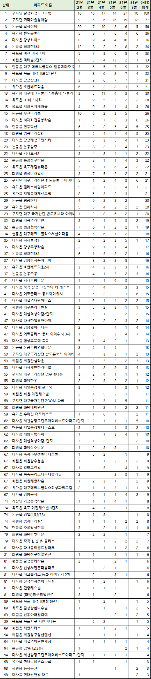 | 5 | 다사읍 협성휴포레 죽곡 | 16.0 | 11.6 | 14.0 | 12.1 | 15.6 | 14.5 | 14.0 |