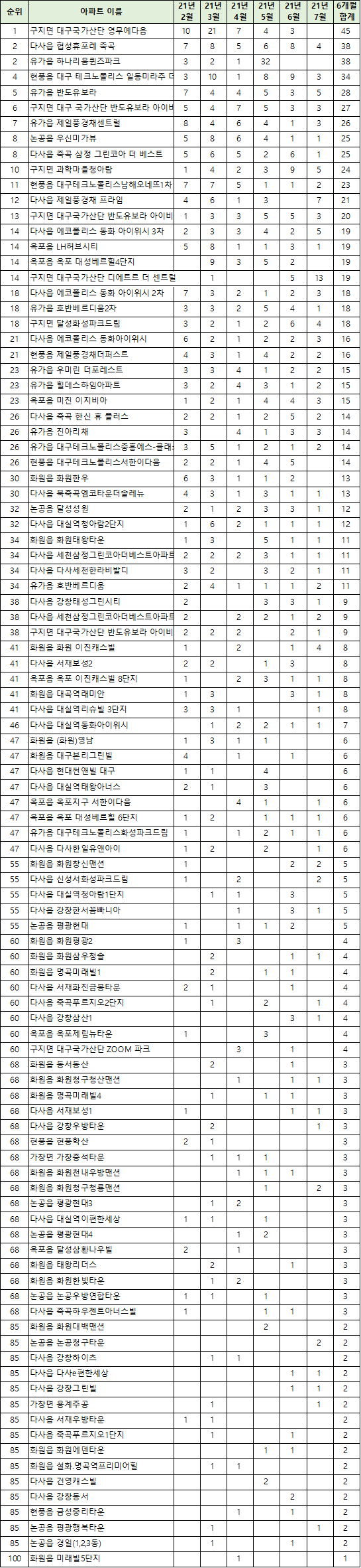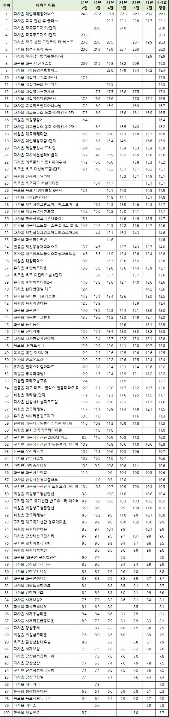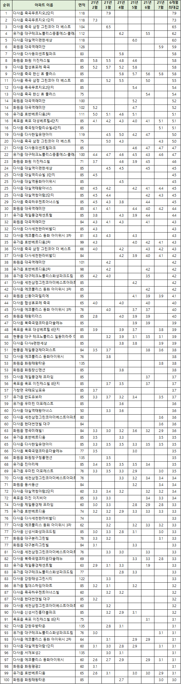 | 93 | 구지면 달성화성파크드림 | 5.6 | 4.7 | 4.7 | 3.2 | 6.2 | 5.9 | 5.4 |