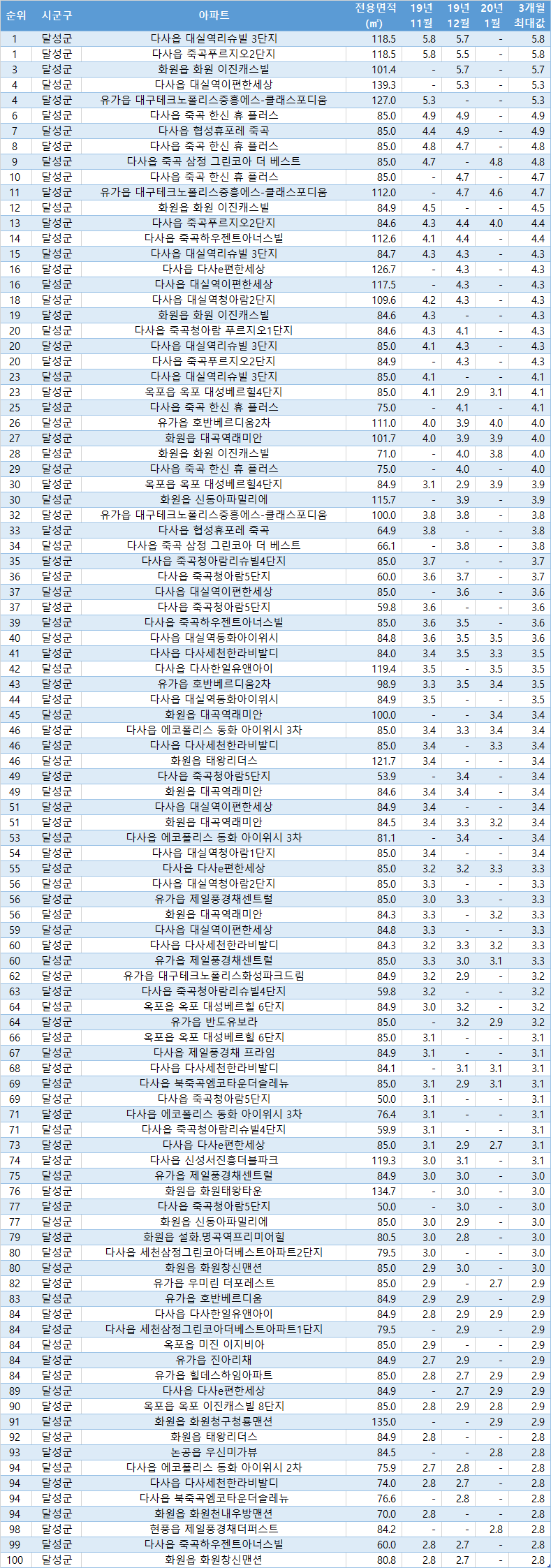 | 20 | 달성군 | 다사읍 대실역리슈빌 3단지 | 85.0 | 4.1 | 4.3 | 4.3 | |