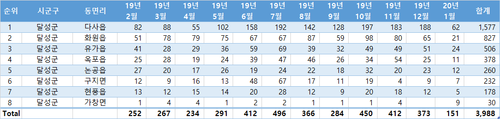 - 2019년 12월 대비 2020년 1월 거래량이 많이 줄었으며, 다사읍이 1,577건으로 가장 많음