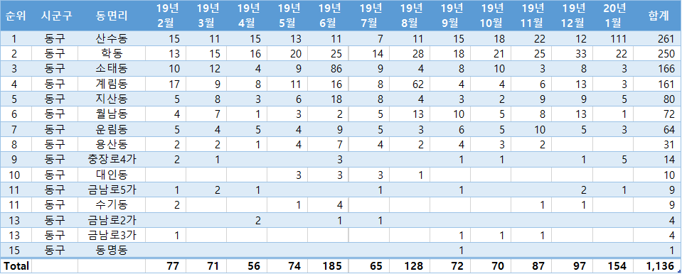 | 4 | 동구 | 월남동 월남호반베르디움 2차 | 13 | 10 | 5 | 8 | 13 | 1 | 50 |