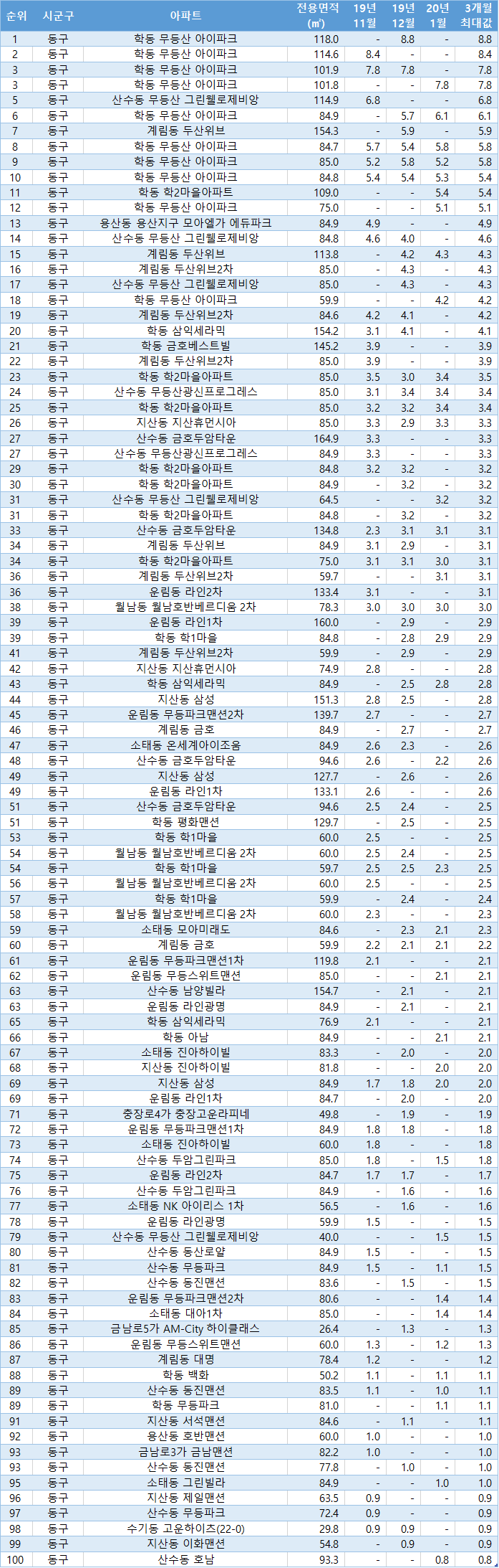 | 광주광역시 광산구 광주 광산 아파트 매매 시세 실거래가 거래량 100순위 2020년 2월 5일 기준 (0) | 2020.02.05 |