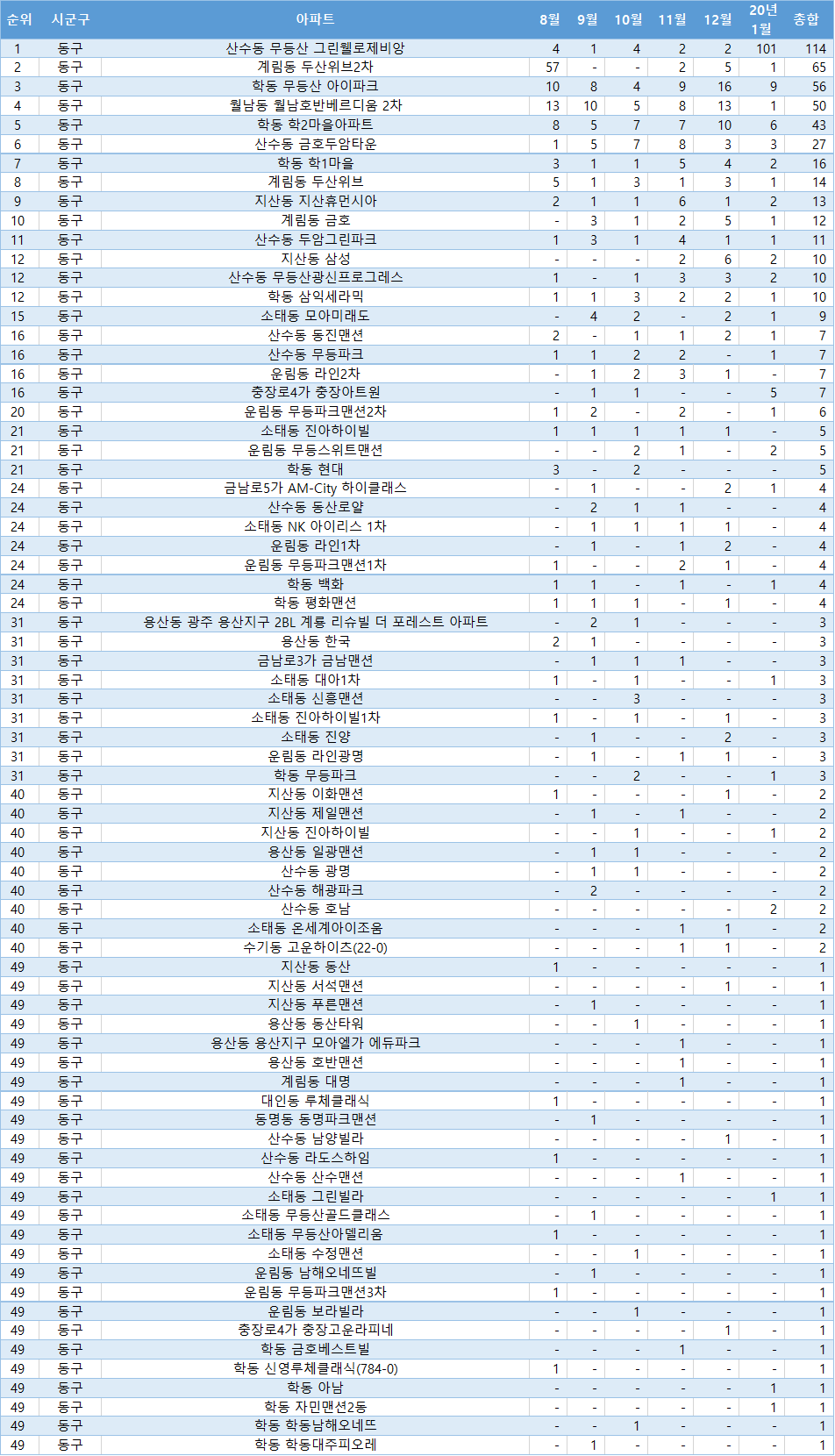 | 1 | 동구 | 산수동 무등산 그린웰로제비앙 | 4 | 1 | 4 | 2 | 2 | 101 | 114 |