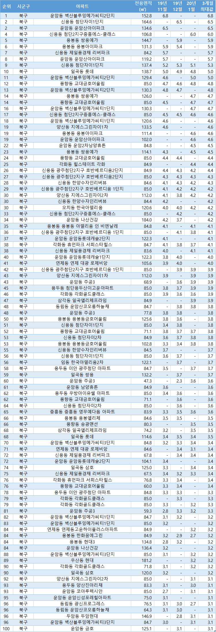 | 19 | 북구 | 운암동 운암산아이파크 | 102.0 | 4.6 | 4.6 | ||